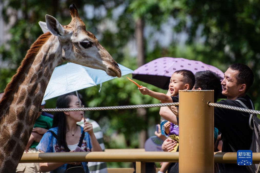 9月16日,游客在武漢動(dòng)物園與長(cháng)頸鹿互動(dòng)。