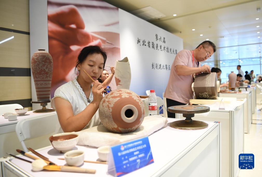 9月16日,在第二十四屆唐山中國陶瓷博覽會(huì )現場(chǎng),參加陶瓷藝術(shù)技藝大賽的選手在比賽中。
