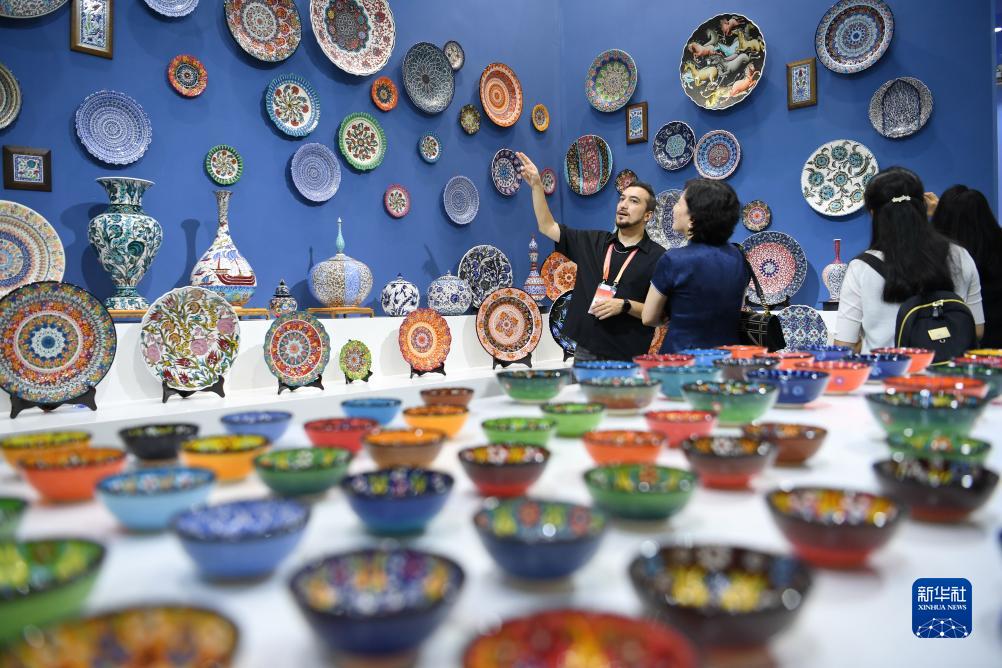 9月16日,來(lái)自土耳其的展商在向參觀(guān)者介紹陶瓷產(chǎn)品。