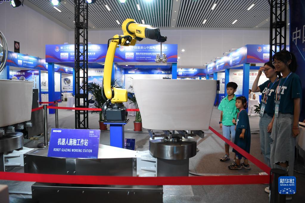 9月16日,參觀(guān)者在第二十四屆唐山中國陶瓷博覽會(huì )現場(chǎng)參觀(guān)一款機器人施釉工作站。