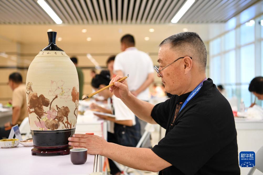 9月16日,在第二十四屆唐山中國陶瓷博覽會(huì )現場(chǎng),參加陶瓷藝術(shù)技藝大賽的選手在比賽中。
