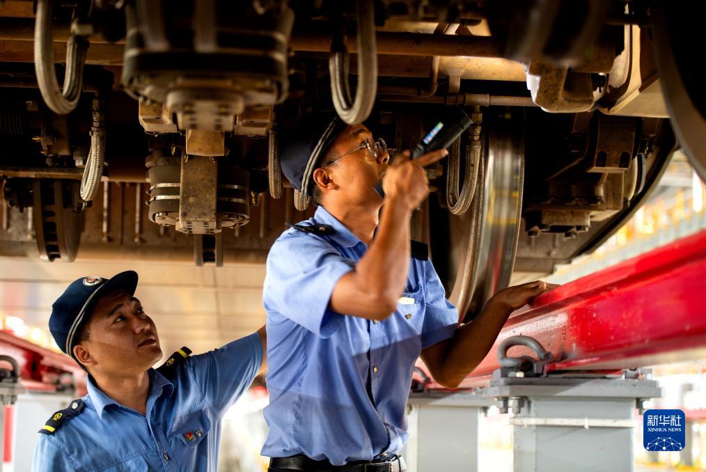 9月13日,高春成(左)和同事對復興號智能配置動(dòng)車(chē)組進(jìn)行走行部檢查。