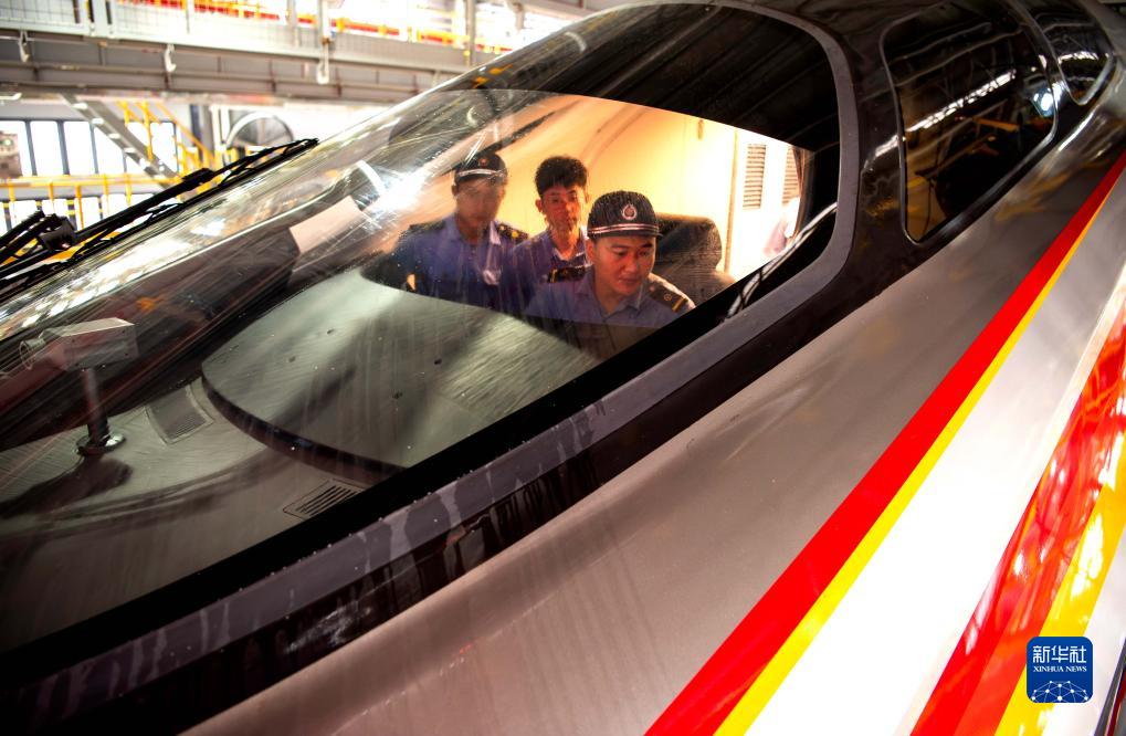 9月13日,高春成(右)和同事在復興號智能配置動(dòng)車(chē)組駕駛艙進(jìn)行檢測。