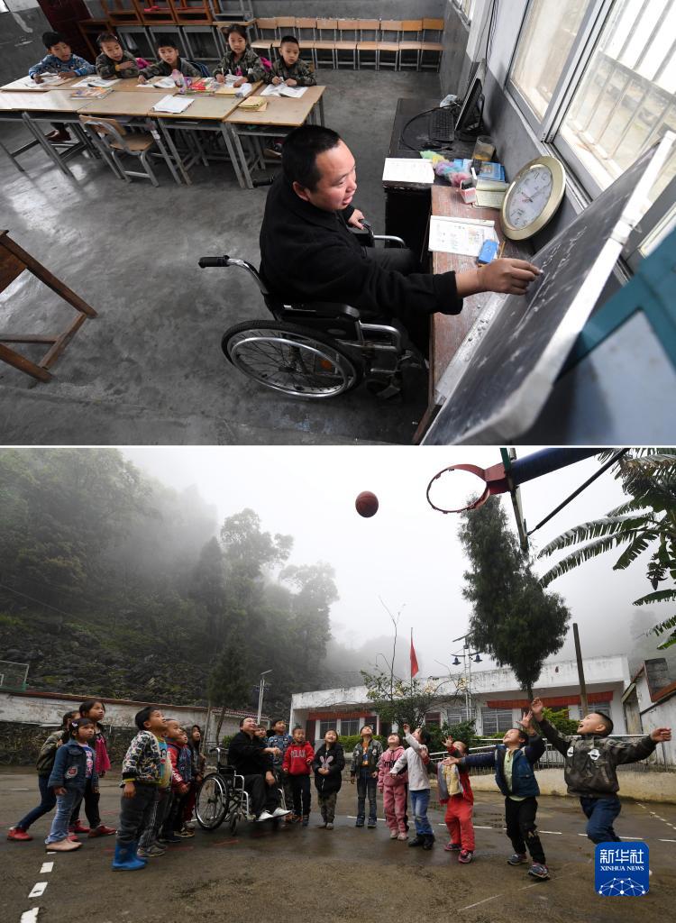 拼版照片:廣西凌云縣下甲鎮河洲村念恩小學(xué)的阮文憑老師給學(xué)生上課(上圖),阮文憑老師在課間和學(xué)生一起玩籃球(下圖)(2019年3月26日攝)。阮文憑老師因小兒麻痹癥致雙腿嚴重萎縮,坐著(zhù)輪椅堅守大山講臺近30年,2010年獲得“中國青年五四獎?wù)隆薄?/p>