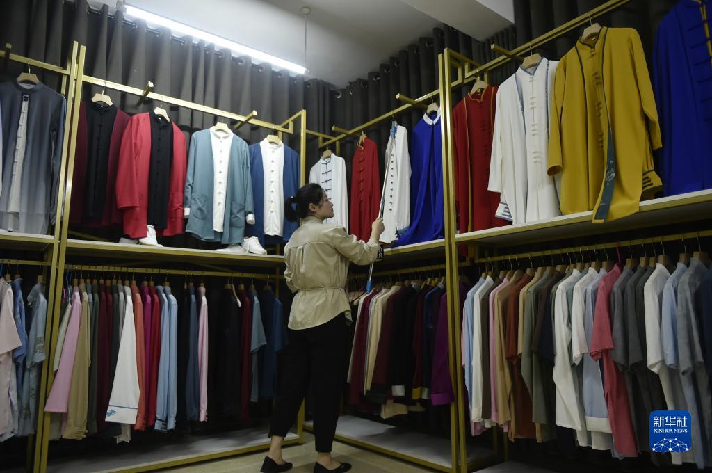9月15日,河南溫縣陳家溝一家服裝生產(chǎn)企業(yè)的工作人員在展廳整理太極練功服。
