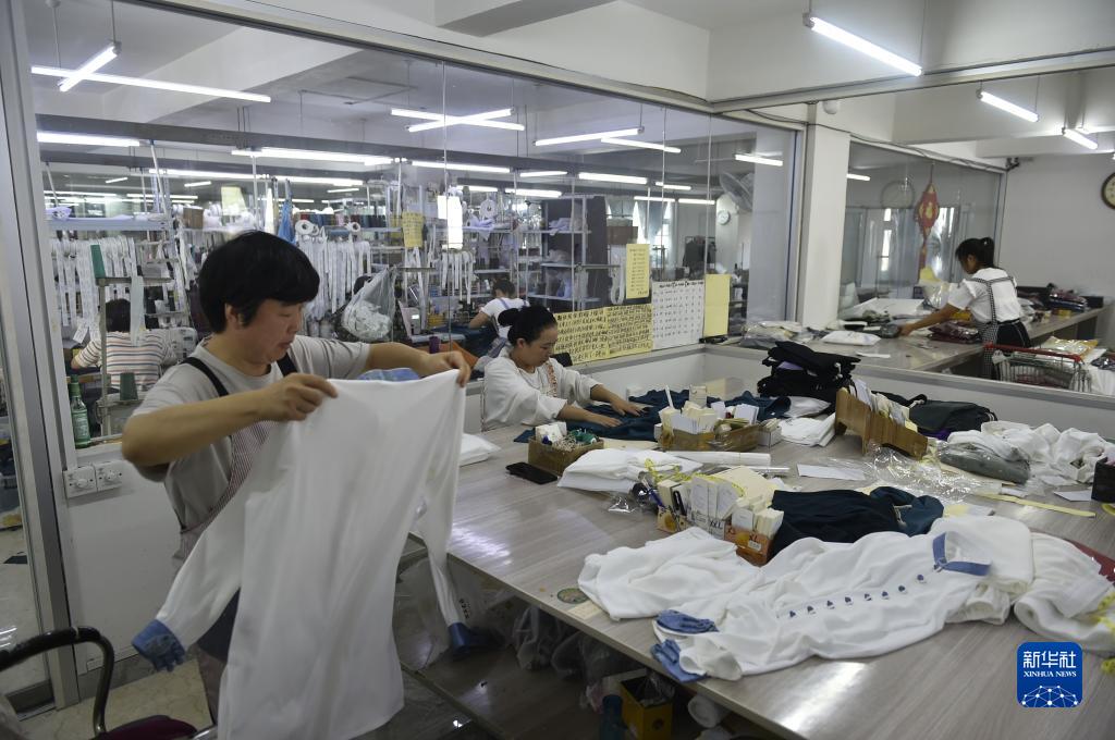9月15日,河南溫縣陳家溝一家服裝生產(chǎn)企業(yè)的工作人員在車(chē)間制作太極練功服。