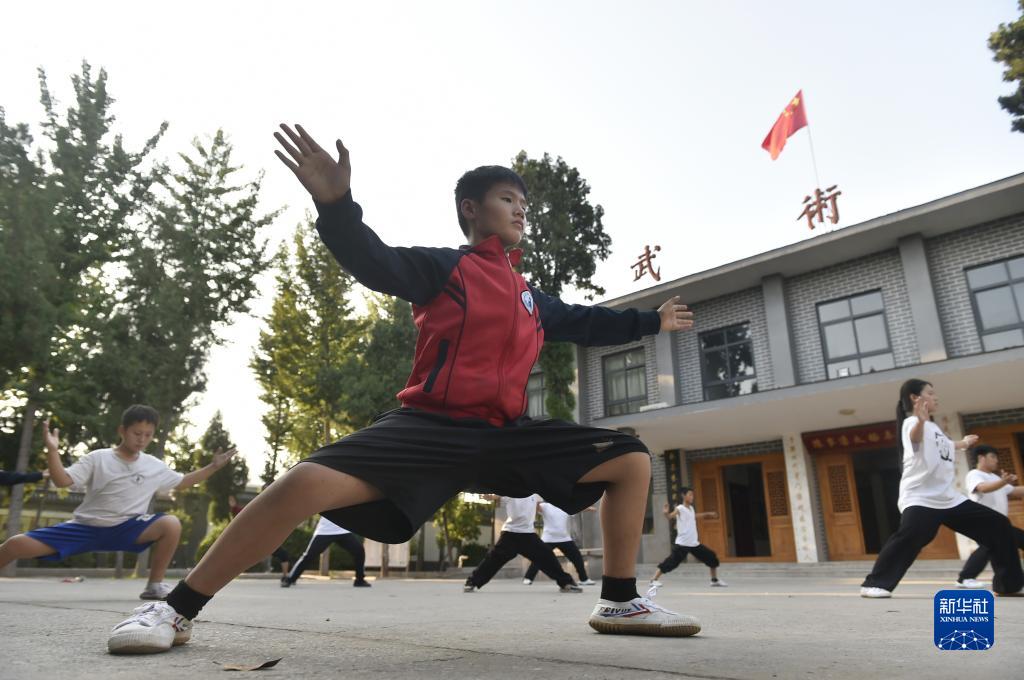9月14日,河南溫縣陳家溝一家武術(shù)學(xué)校的學(xué)員在練習太極拳。