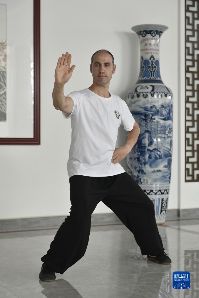 9月15日,來(lái)自西班牙的太極拳愛(ài)好者小龍在河南溫縣陳家溝的一處家庭武館練習太極拳。