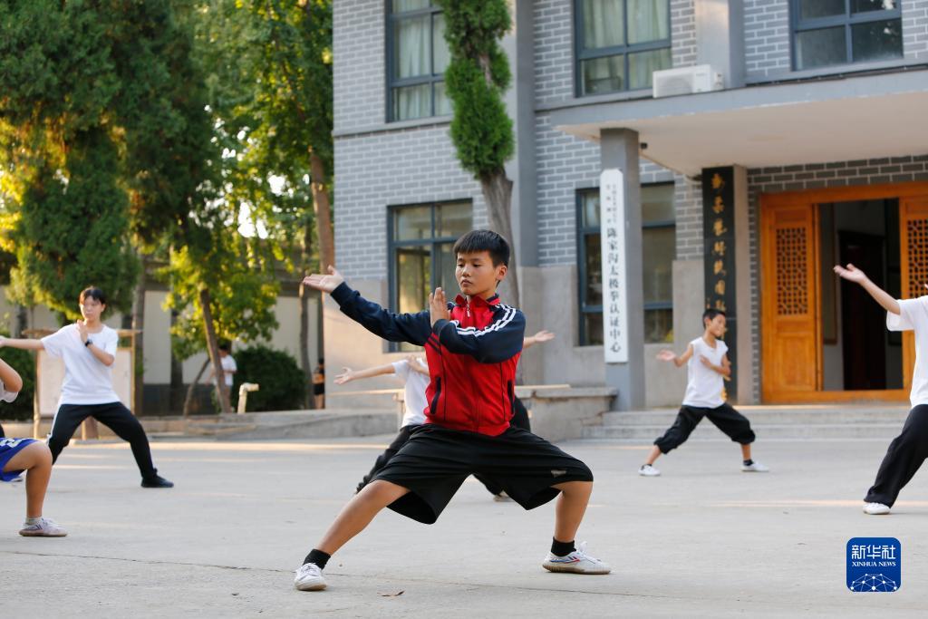 9月14日,河南溫縣陳家溝一家武術(shù)學(xué)校的學(xué)員在練習太極拳。