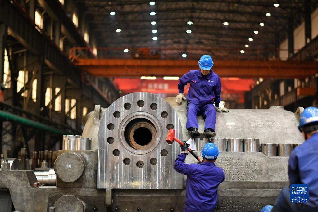 在哈電集團哈爾濱汽輪機廠(chǎng)有限責任公司車(chē)間,工人在生產(chǎn)作業(yè)(2023年4月11日攝)。