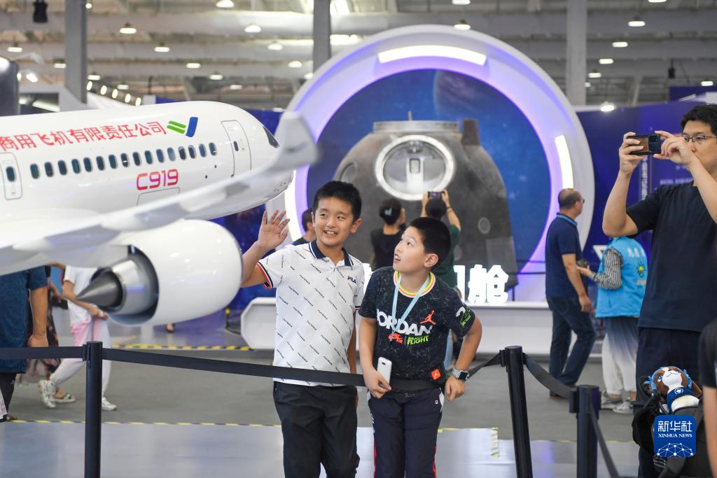 9月17日,在全國科普日北京主場(chǎng)活動(dòng)展區,參觀(guān)者參觀(guān)展出的C919大飛機模型。