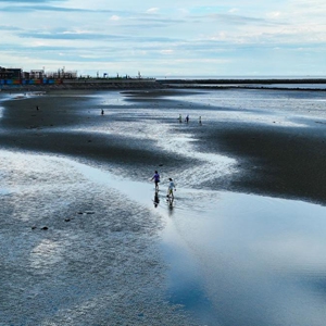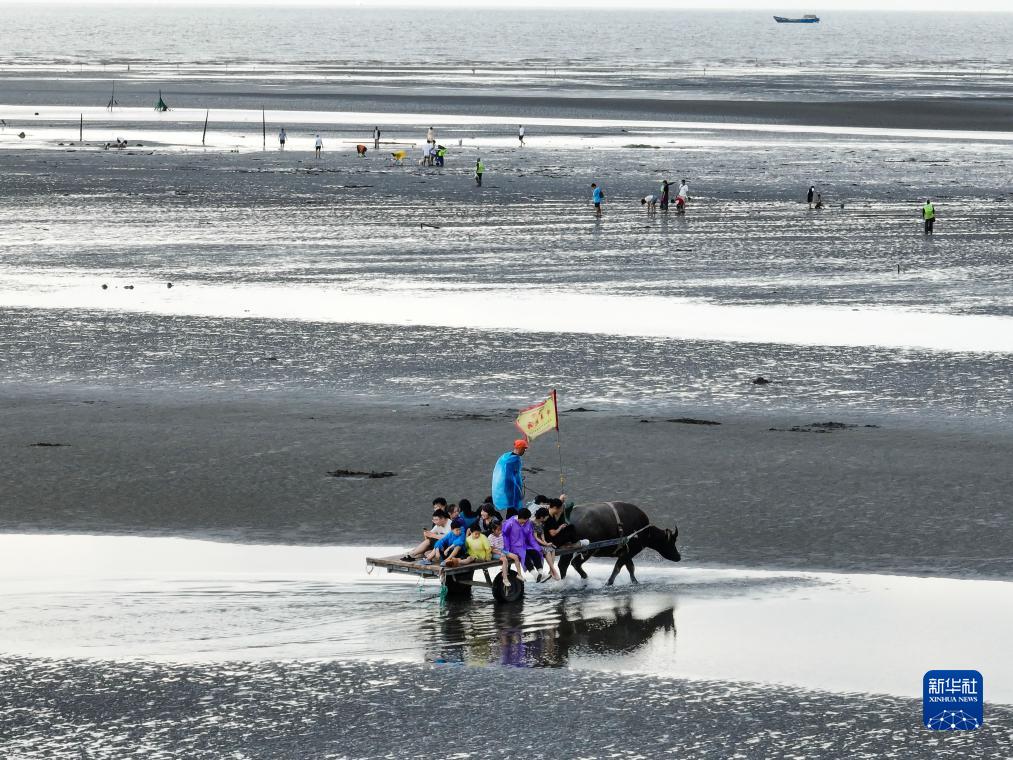 9月16日,游客在啟東“十里海灣”灘涂上體驗坐牛車(chē)(無(wú)人機照片)。