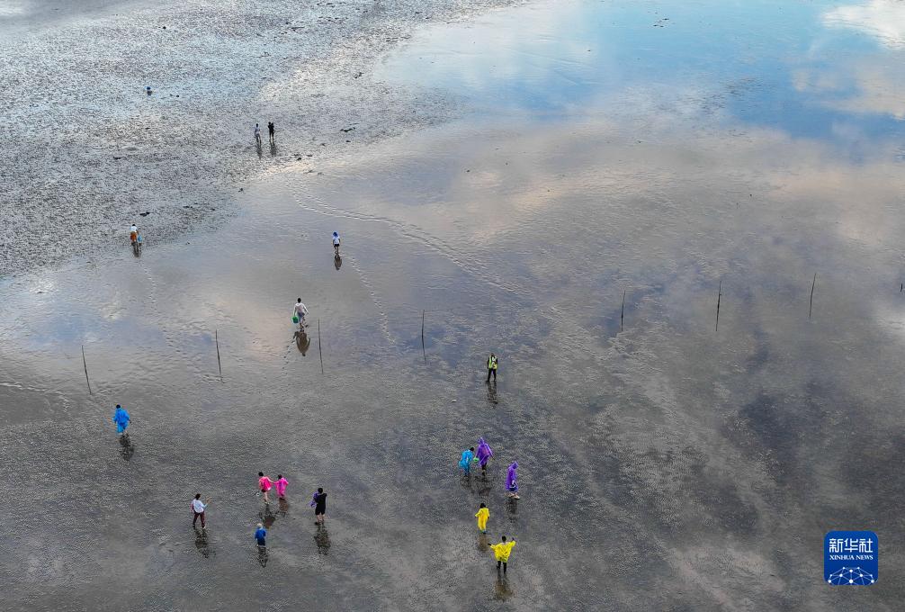 9月16日,游客在啟東“十里海灣”灘涂上游玩(無(wú)人機照片)。