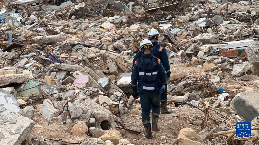 9月17日,國際救援人員在利比亞德?tīng)柤{的建筑廢墟上工作。