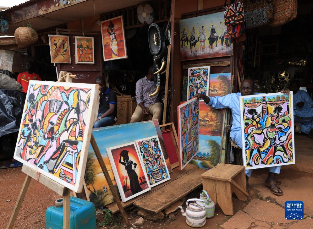 9月16日,在喀麥隆首都雅溫得手工藝品市場(chǎng),商販在售賣(mài)繪畫(huà)作品。