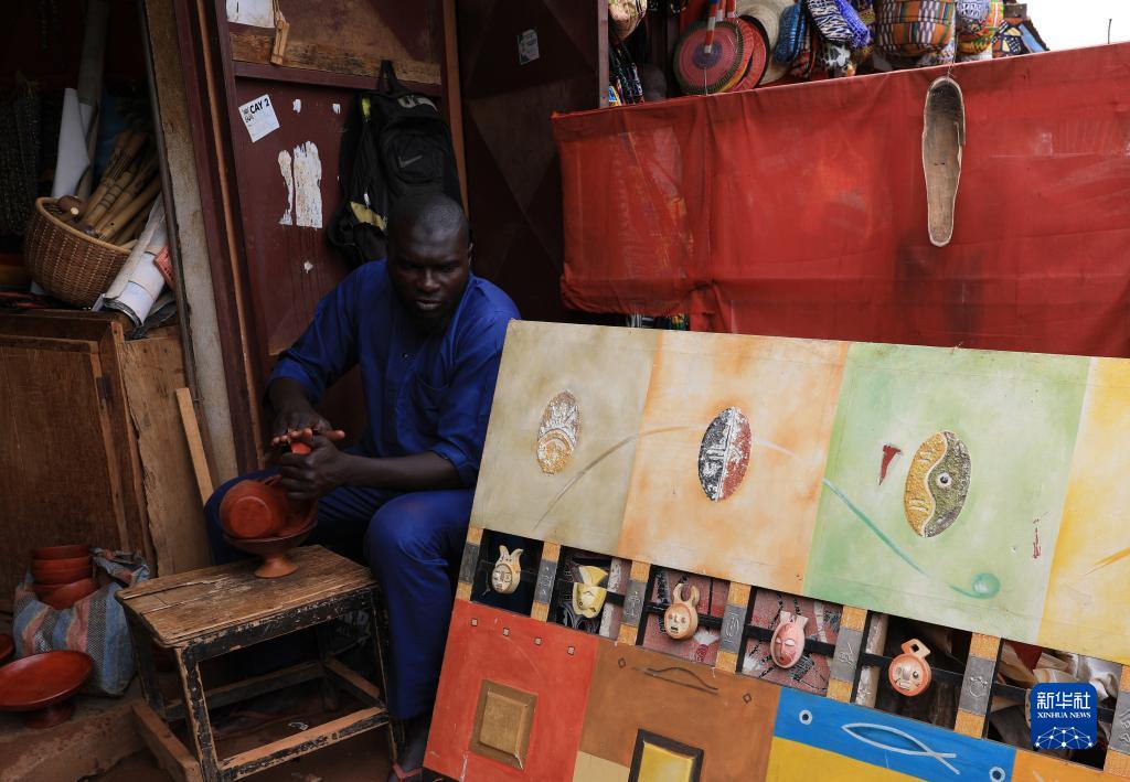 9月16日,在喀麥隆首都雅溫得手工藝品市場(chǎng),一名手工藝人在制作手工藝品。
