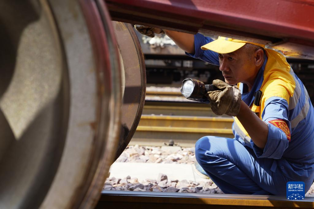 9月17日,中歐班列(鄭州)整備班組貨車(chē)檢車(chē)員在檢查脫軌自動(dòng)制動(dòng)裝置。
