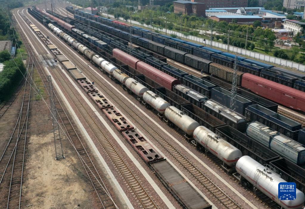 9月17日,在鄭州北站編組場(chǎng),為中歐班列(鄭州)選扣好的空車(chē)底完成集結(無(wú)人機照片)。