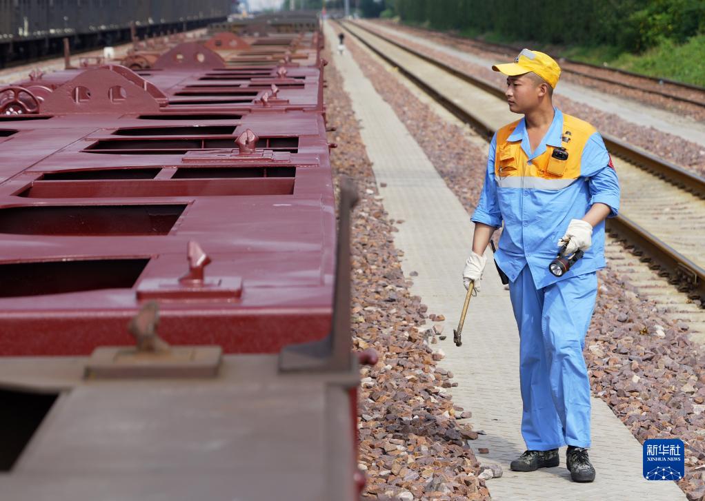 9月17日,中歐班列(鄭州)整備班組貨車(chē)檢車(chē)員在檢查車(chē)輛集裝箱鎖頭。
