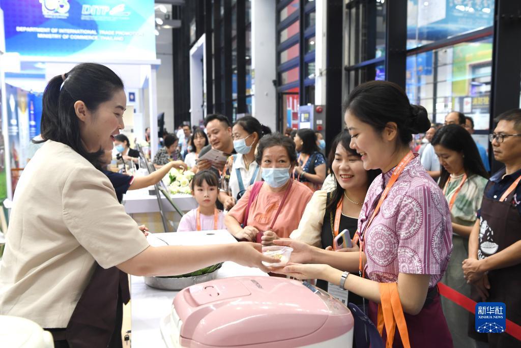 9月18日,在南寧國際會(huì )展中心,觀(guān)眾在泰國商品館排隊品嘗泰國香米。