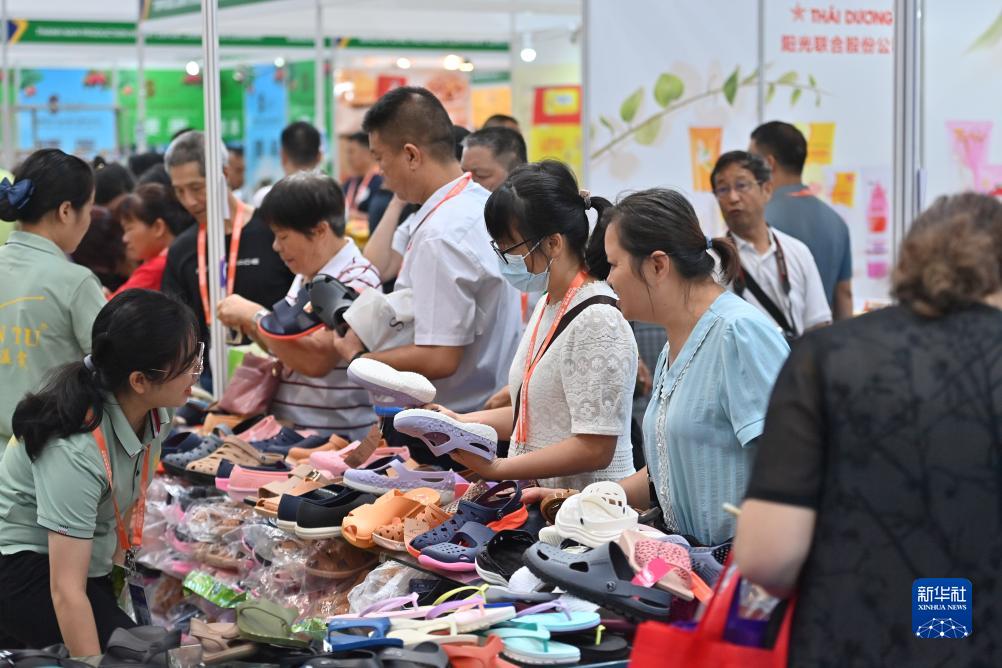 9月18日,在南寧國際會(huì )展中心,觀(guān)眾在選購越南拖鞋。