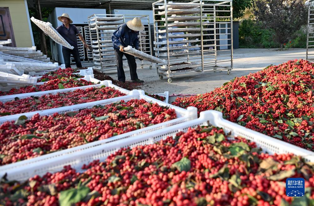 9月18日,唐山市豐潤區火石營(yíng)鎮東高莊村的農民晾曬五味子。
