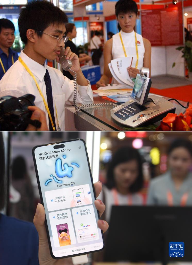 拼版照片:上圖為2005年10月19日,在第2屆中國—東盟博覽會(huì )上,一名參展商在展示一款電話(huà)機(新華社記者劉廣銘攝);下圖為2023年9月18日,在第20屆中國—東盟博覽會(huì )上,一名參展工作人員在展示一款手機(新華社記者陸波岸攝)。