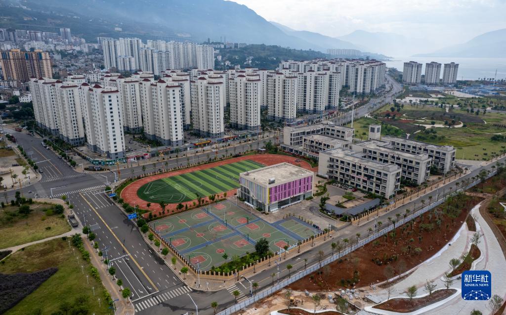 這是9月18日拍攝的位于巧家縣城的白鶴灘水電站移民搬遷安置樓房及配套的立鶴小學(xué)(無(wú)人機照片)。