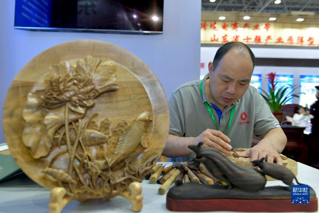 9月19日,在菏澤國際會(huì )展中心,一名男子在展示木藝雕刻。