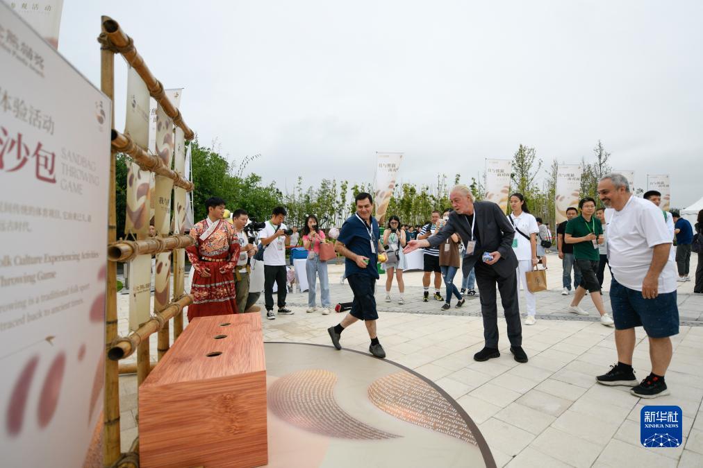 9月19日,敘利亞導演納杰達·伊斯梅爾·安佐爾(前右二)在活動(dòng)現場(chǎng)體驗“扔沙包”。