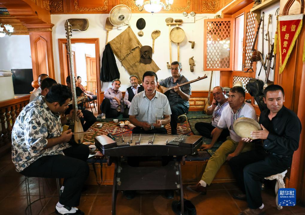 樂(lè )手在新疆喀什古城百年老茶館內彈唱(9月7日攝)。