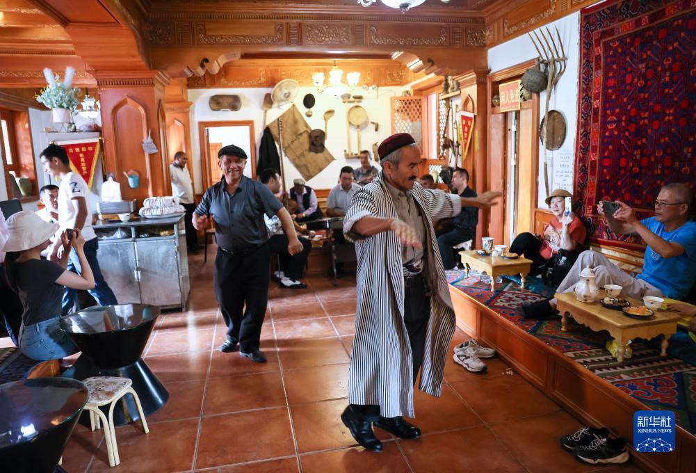 在新疆喀什古城百年老茶館內,人們隨音樂(lè )起舞(9月7日攝)。