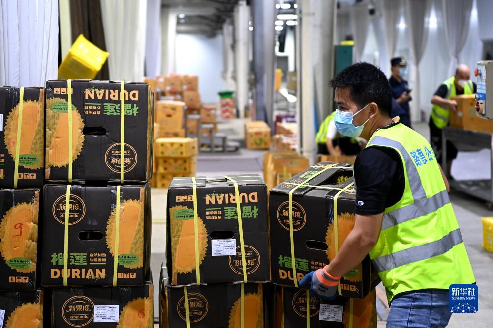9月12日,在廣西憑祥友誼關(guān)口岸,工作人員搬運等待通關(guān)的榴蓮。
