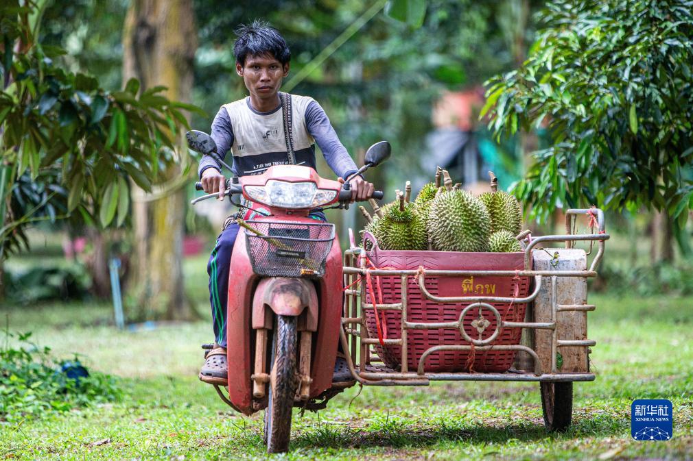 9月18日,在泰國春蓬府一處果園內,工人在運送剛采摘的榴蓮。