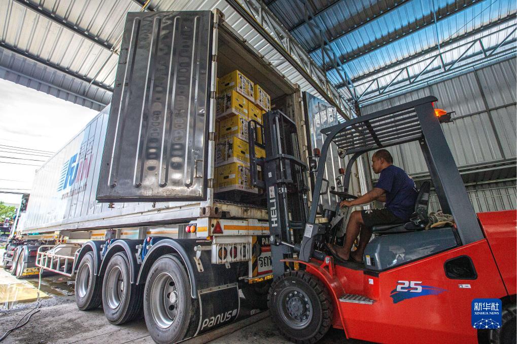9月19日,在泰國春蓬府一家榴蓮工廠(chǎng)內,工作人員將包裝好的榴蓮裝車(chē)。