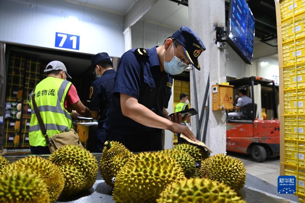 9月12日,在廣西憑祥友誼關(guān)口岸,海關(guān)工作人員對進(jìn)口的榴蓮進(jìn)行查驗。