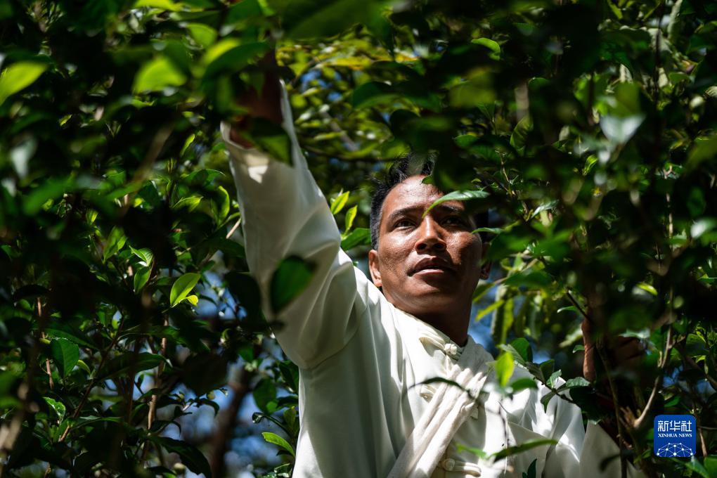 9月19日,景邁山翁基古寨的布朗族茶農哎少在古茶林里采摘秋茶。