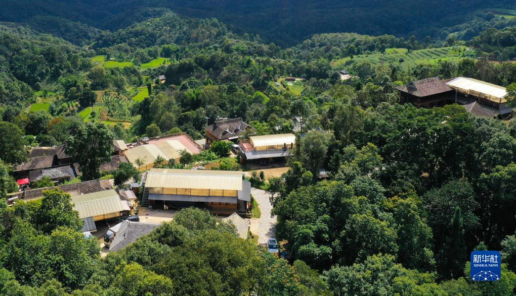 景邁山芒景村許多村民住宅頂層都設置有晾曬茶葉的棚子 (無(wú)人機照片,8月30日攝)。