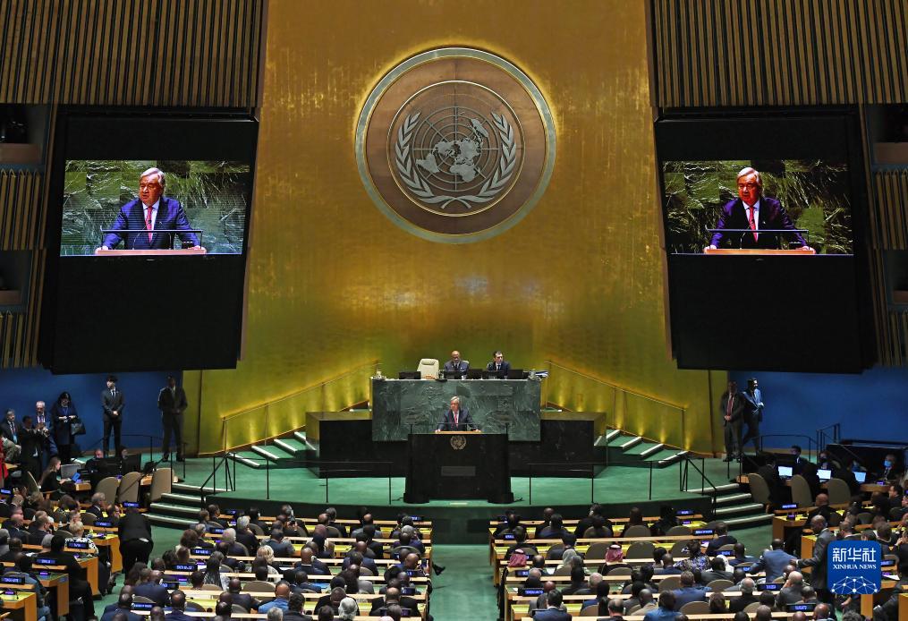9月19日,在位于紐約的聯(lián)合國總部,聯(lián)合國秘書(shū)長(cháng)古特雷斯在第78屆聯(lián)合國大會(huì )一般性辯論開(kāi)幕式上講話(huà)。