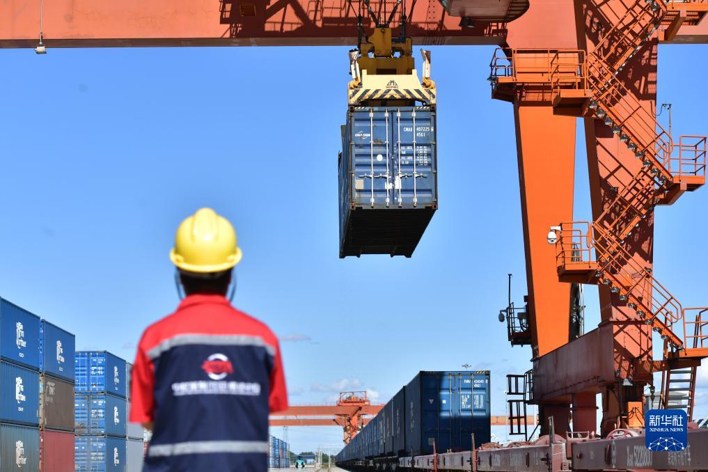 9月19日,在中歐班列(沈陽(yáng))集結中心,中國鐵路沈陽(yáng)局集團有限公司工作人員使用龍門(mén)吊進(jìn)行中歐班列裝車(chē)作業(yè)。