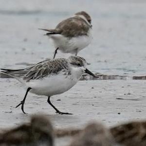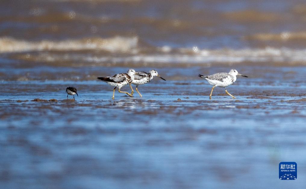國家一級保護動(dòng)物小青腳鷸(右一)在東臺條子泥濕地上覓食(8月19日攝)。