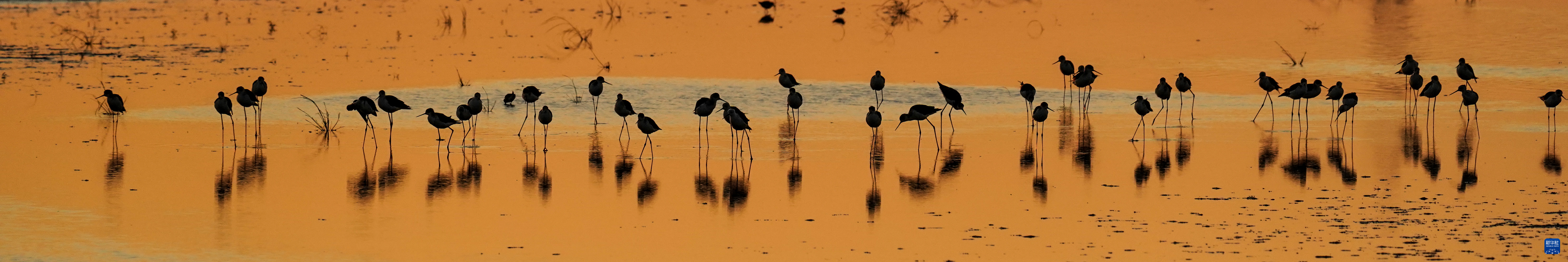 群鳥(niǎo)棲息在夕陽(yáng)下的東臺條子泥濕地(8月31日攝)。