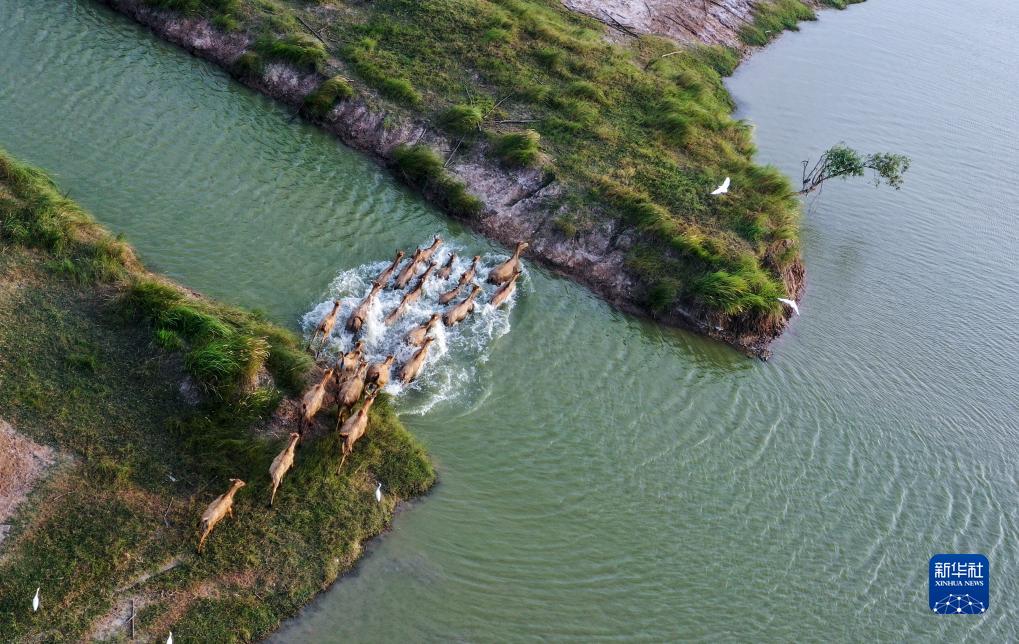 一群麋鹿在大豐麋鹿國家級自然保護區野鹿蕩渡河(8月20日攝,無(wú)人機照片)。