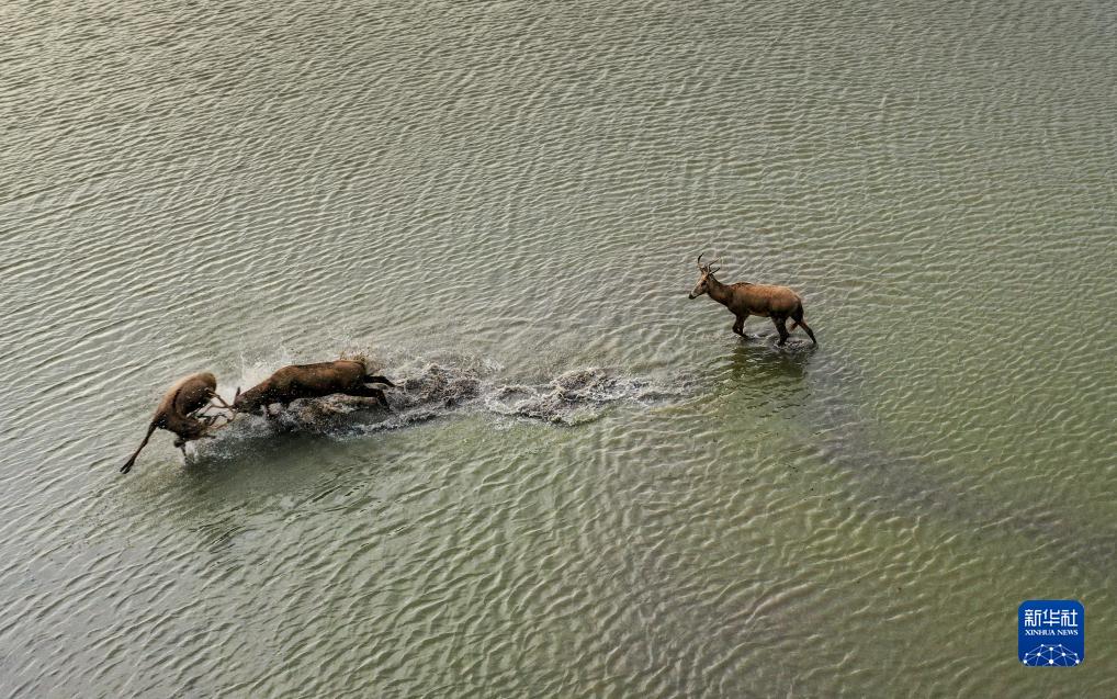 麋鹿在大豐麋鹿國家級自然保護區野鹿蕩的水塘里爭斗(8月20日攝,無(wú)人機照片)。