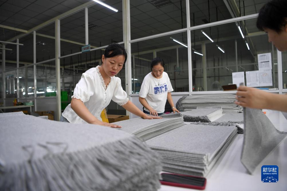 9月20日,安美橋(南宮)羊絨制品有限公司的工人在包裝用于出口的羊絨圍巾。