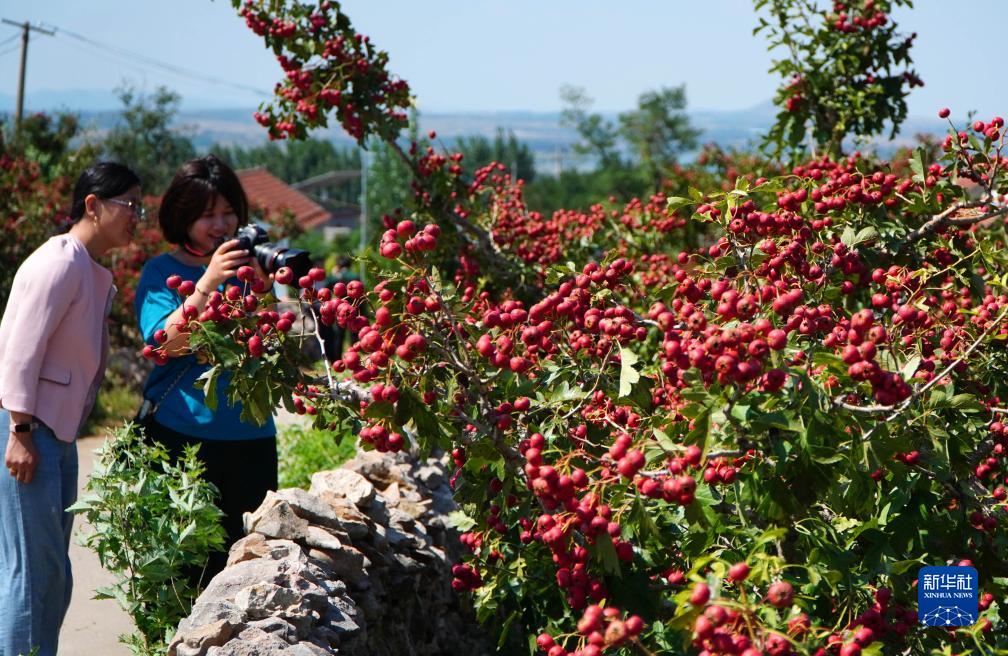 9月20日,在山東省新泰市劉杜鎮,兩名游客在拍攝成熟的山楂。