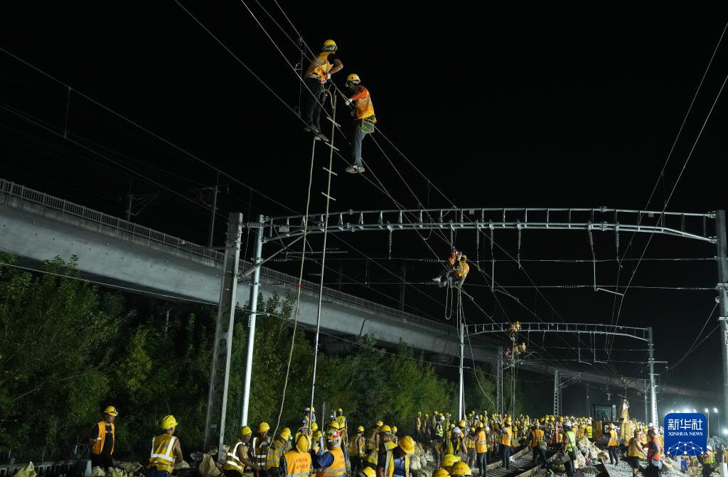 9月19日夜晚,施工人員在滬昆鐵路上海七寶至春申段線(xiàn)路上作業(yè)。