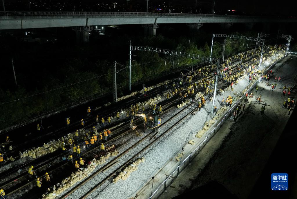9月19日夜晚,施工人員在滬昆鐵路上海七寶至春申段線(xiàn)路上作業(yè)。