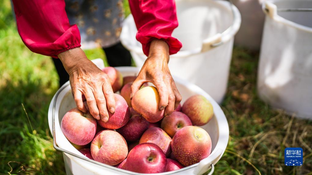 威寧彝族回族苗族自治縣雪山鎮謝家村村民在采收蘋(píng)果(9月20日攝)。