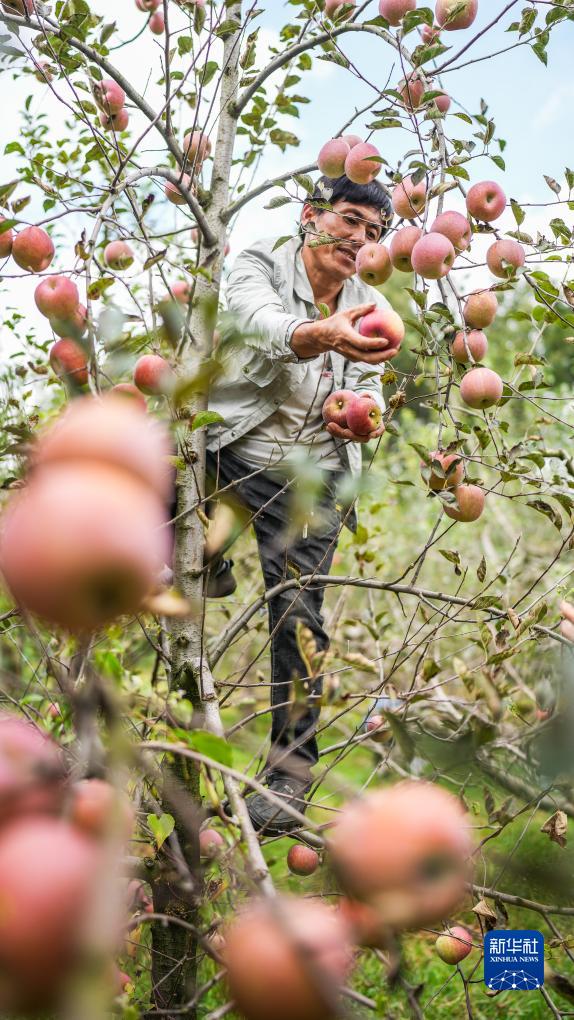 威寧彝族回族苗族自治縣雪山鎮謝家村村民在采收蘋(píng)果(9月20日攝)。